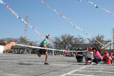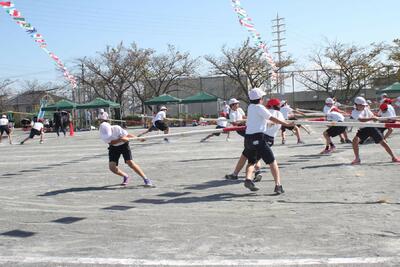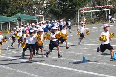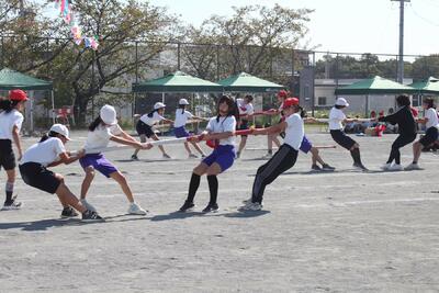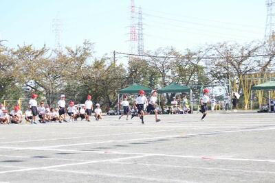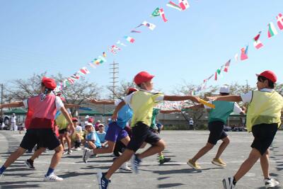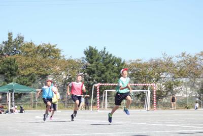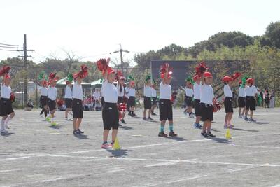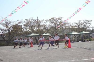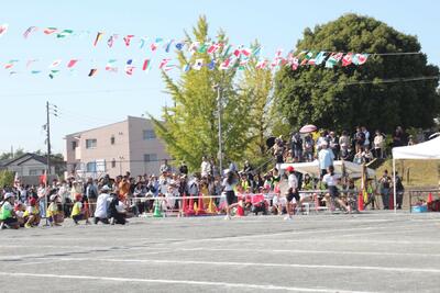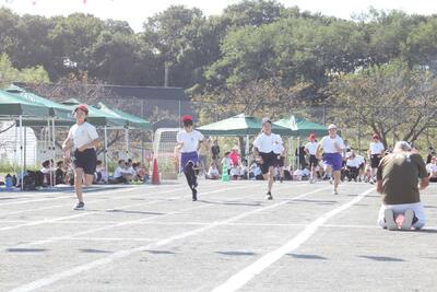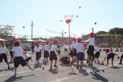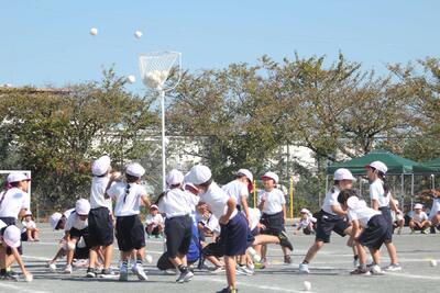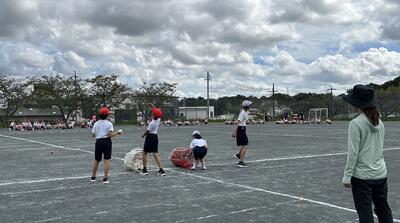 「追っかけ玉入れ」と言って、教員が背負ったかごに多く玉を入れた方が勝ちです。1・2年生の部、3・4年生の部、5・6年生の部と3回勝負で、白組が2勝でした。