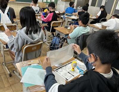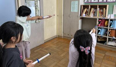 ◆理科での「空気」の学習の様子です。空気でっぽうで、自分の作った的を狙います。空気を押し縮めた分、勢いよく玉が飛び出ていきます!