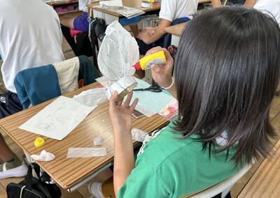 【図工】11月の校内作品展に向けて、作品を作っています。6年生はランプシェードですが、針金で形作って紙を貼っていきます。