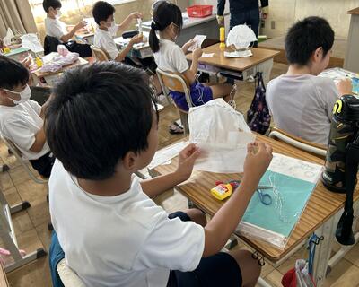 【家庭科】5・6年生が取り組んでいる教科です。今日は「本返し縫い」に挑戦していました。