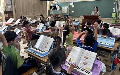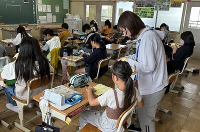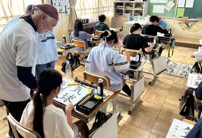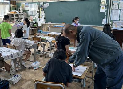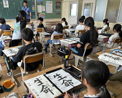 作品展に向けて習字もがんばっています! 音楽や図工の学習もあります。