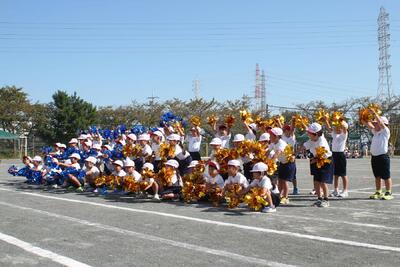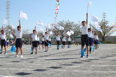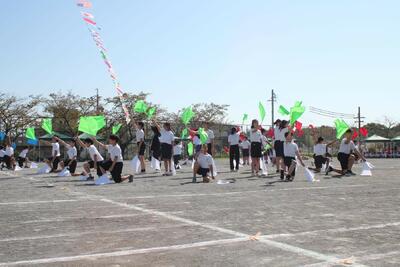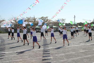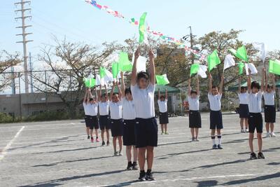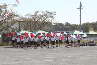 5・6年生。旗を使ってのダンスをお楽しみに! 隊形移動があります!