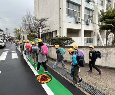◆朝の登校の様子です。通学団で並んで登校していますね。特に1年生がいる班は手をつないてくれている姿があります。優しく気にかけてくれて、ありがとう! 明日から2年生以上は給食が始まります。4・5月は、とりわけ車の通りも多いので、登校、下校、どちらとも、周りをよく見て交通安全に気を付けてください。
