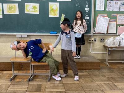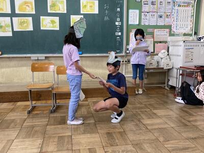 2つのグループに分かれ、それぞれの役をとっても上手に音読と演技を行っていました。