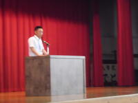 久々に朝会が行われました。先週の猛暑日をうけて、校長先生からは暑いときのマスクの危険性についてお話しを聞きました。また、新しい仲間の紹介もありました。今週は、少し暑さは和らぎますが、水分を適切に補給したり、マスクを外したりするなど、熱中症には注意して過ごしてほしいと思います。