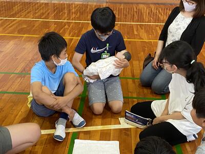 また、実際の赤ちゃんの人形を使って抱っこ体験も行い、意外な重さにびっくりしていました。