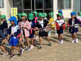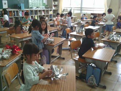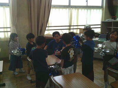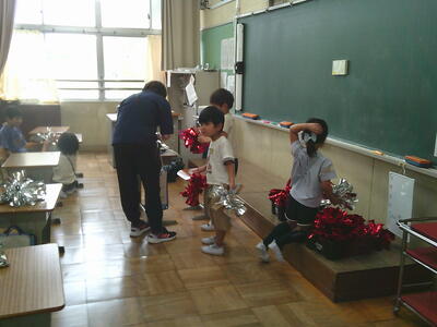 今日は、1年2組が運動会のダンスで使用するポンポンを作っていました。銀色と赤色のセットです。上手に開いたポンポンを友達に見せたり、開くのが難しい子は手伝ったもらったり、仲良く一生懸命作っていました。また、1年1組は、すでにポンポンが完成していました。机の横に銀色と青色のポンポンがかかっていました。休み時間には、けしピン大会の応援にさっそくポンポンが活躍していました。運動会は、1・2年生各2クラス、合計4色のポンポンで踊ります。今から楽しみです。
