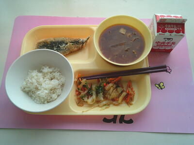 今日の給食は、麦ごはん(画像はご飯少なめです)、いわしかば焼き風、ごまあえ、ぶた汁