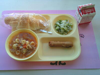 クロワッサン、焼きチキンウインナー、グリーンサラダ、ミネストローネ