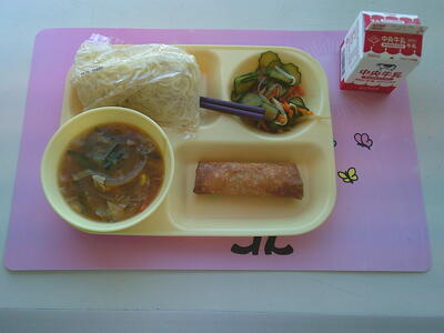 でした。みんな大好きラーメンの日!朝から「ラーメンだ!やった~」という声があちらこちらから聞こえてきていました。愛知の野菜たっぷりの春巻は、ぱりぱりでとてもおいしかったです。今日も、みんなたくさん食べました。