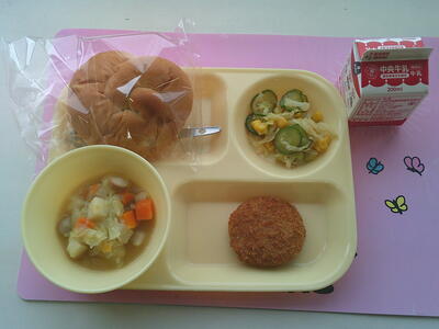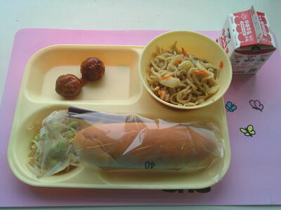 小型ロールパン、塩焼きそば、愛知県産食材入り肉団子(2個)、もやしと枝豆のあえ物