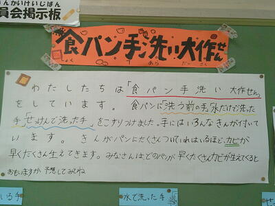 今日は、保健委員会の活動を紹介します。食パン手洗い大作戦を実施中です。