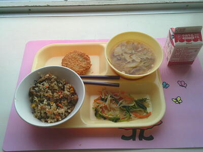 ひじきごはん、和風コロッケ、おひたし、白菜のとろみ汁