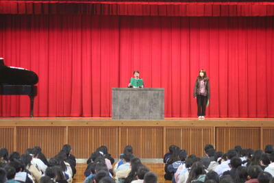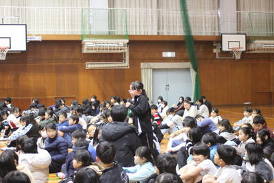 1月15日(木)に、生活安全委員会の発表がありました。今回は、読み聞かせです。「ライオンのくにのねずみ」というお話でした。真剣に話を聞く姿が印象的でした。「見た目で判断してはいけない」という感想が寄せられました。発表した、生活安全委員からは、「たくさん練習したのでかまずに言えてよかったです。」という感想が寄せられました。