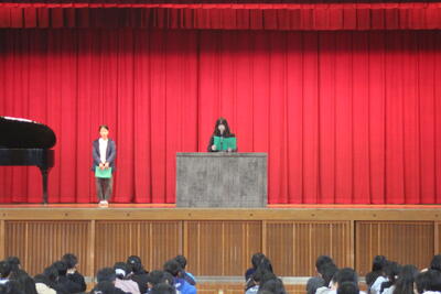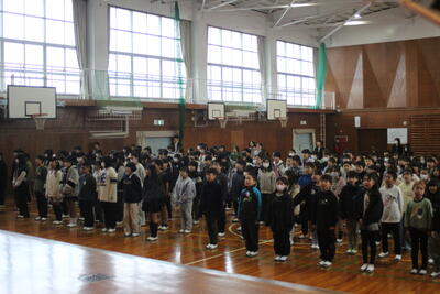 3学期の始業式は、児童会役員を先頭に元気いっぱいのあいさつで始まりました。児童代表の言葉は、4年生と6年生。二人とも、3学期にがんばりたいことやその理由をしっかり発表することができました。児童の皆さんも、真剣に聞き入っており、それぞれ心の中には3学期の目標を持つことができているのだろうと思いました。まとめの3学期。みんなで力を合わせて次の学年へステップアップできるよう頑張っていきましょう。